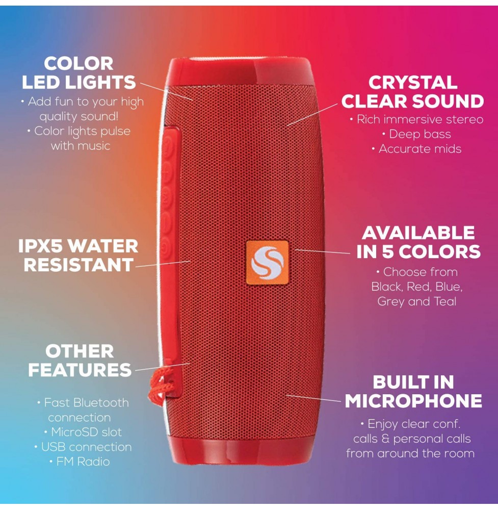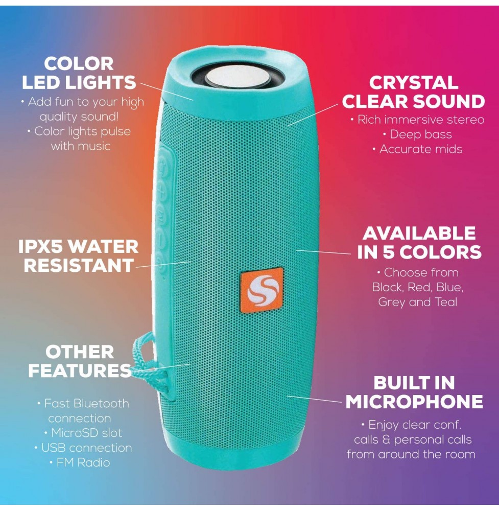 Description: SilverOnyx portable Bluetooth speaker provides powerful, crystal clear stereo sound, deep bass, and accurate mids and highs. This compact, Ipx5 waterproof speaker is powered by a long lasting rechargeable Li ion battery, so you can have music with you all day, wherever life takes you. Light show: lighting can pulse to your music and add some color to your environment. Built in microphone allows you to easily take personal and conference calls with clear quality. Ipx5 Water Resistant technology makes is perfect for the beach, pool, shower or anywhere else you go. Can resist indirect water spray and splash, but cannot be submerged. Bluetooth 4.2 technology provides longer range, higher quality and faster connection. Features: Bluetooth 4.2 Led Lights Ipx5 Water Resistant Microphone MicroSd 3.5mm Aux In Usb Radio Specifications: Range: 33 feet Battery: 3.7V 1200mAh Speaker Driver: 57mm x 2 Frequency: 120Hz to 20Khz Unit Size: 72.6 x 72.9 x 178.7mm Unit Weight: 490g What's in the Box: 1 x SilverOnyx 157 Speaker 1 x 3.5mm Aux Line In Cable.