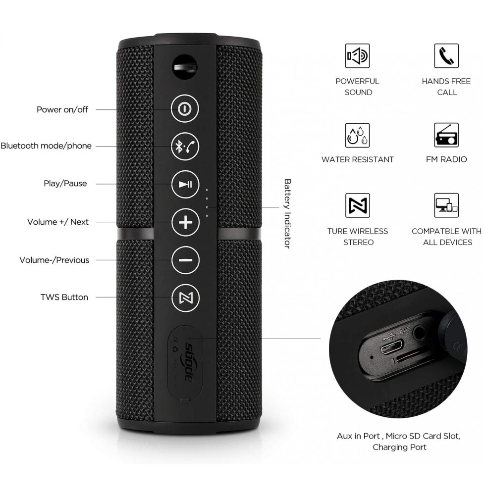 The “TWS” button also known as “true wireless stereo” which allows you to sync two of these speakers together,mimicking the effect of an actual stereo system by delivering dual-channel (right and left) audio.